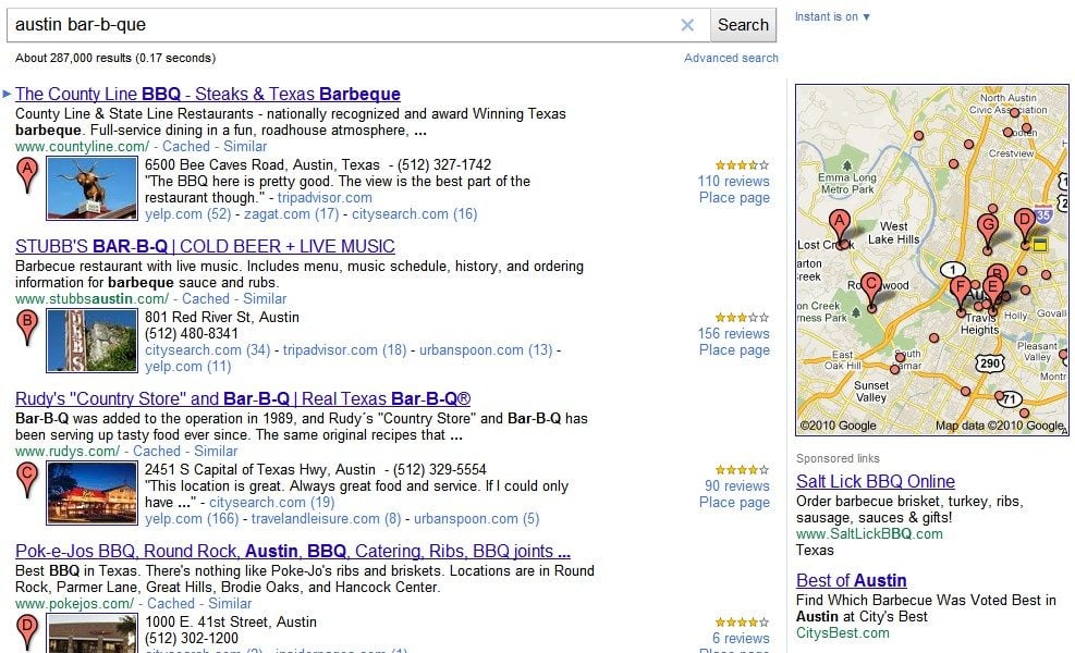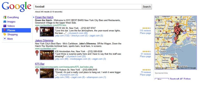 Google affichait déjà certains résultats lors d’une recherche de ce genre, en affichant notamment une carte avec des repères rouges et quelques liens pointant sur les endroits recherchés (avec numéro de téléphone éventuel). Le moteur américain annonce qu’il va modifier l’affichage en plaçant la carte à droite (avec les liens au-dessous), et en affichant des résultats provenant de différentes sources, qui ont publié des critiques de restaurant, par exemple. « L’information est groupée de façon pratique, pour faciliter les comparaisons », note Jackie Bavaro, responsable produit.