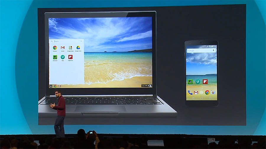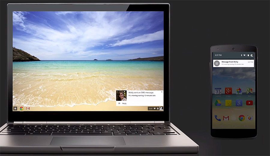 Le rapprochement Android/Chrome devrait aller plus loin que le partage de logiciels puisque que Google a démontré l’interaction poussée d’Android et Chrome OS : avec le prochain Android L, le téléphone pourra servir à débloquer le Chromebook voire vous authentifier directement sur vos sites favoris par la simple détection de la présence du smartphone. Dans l’autre sens, les Chromebook pourront afficher l’état de votre téléphone – notamment celui de la batterie.