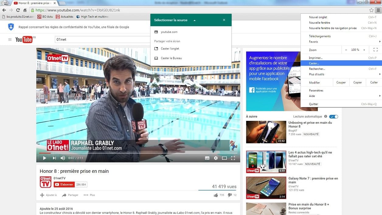 Google vient de faire franchir un pas de plus à sa fonction Cast, qui permet de diffuser de la vidéo ou de l’audio d’un site Internet sur son téléviseur. Pour cela, il faut utiliser un appareil compatible, le plus répandu étant le petit boîtier Chromecast (ou Chromecast audio pour la version réservée uniquement au son). La fonction nécessitait également d’installer une extension sur le navigateur Chrome. Ce n’est plus le cas car la fonction Cast est désormais directement intégrée dans la dernière version du navigateur de Google (52.0.2743.116). Après avoir effectué la mise à jour, une entrée « Caster » apparait dans le menu principal de Chrome.