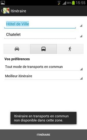 Malheureusement en France, seules quatre villes (Bordeaux, Cholet, Dax et Maubeuge) offrent la recherche d’itinéraire et les horaires de passage en temps réel des différents moyens de transport. Paris, Lille, Lyon, Strasbourg et Marseille n’ont pas libéré leurs données pour que Google puisse les intégrer. La RATP n’a rendu publique qu’une partie de ses données (plan de métro, de RER, position géographique de stations) que le 31 juillet dernier, dans le cadre du projet Open data du gouvernement. Nous avons contacté la RATP pour savoir si elle était disposée à libérer aussi les horaires de passage de ses moyens de transport. La Régie se dit « dans une position d’ouverture et d’écoute » mais « souhaite sauvegarder un lien privilégié avec ses clients », nous a expliqué un porte-parole de la RATP. En clair, elle n’est pas prête à rendre publics ses horaires et voir Google Maps devenir une concurrente de son application RATP téléchargée à ce jour à 2,8 millions d’exemplaires pour iOS et Android.