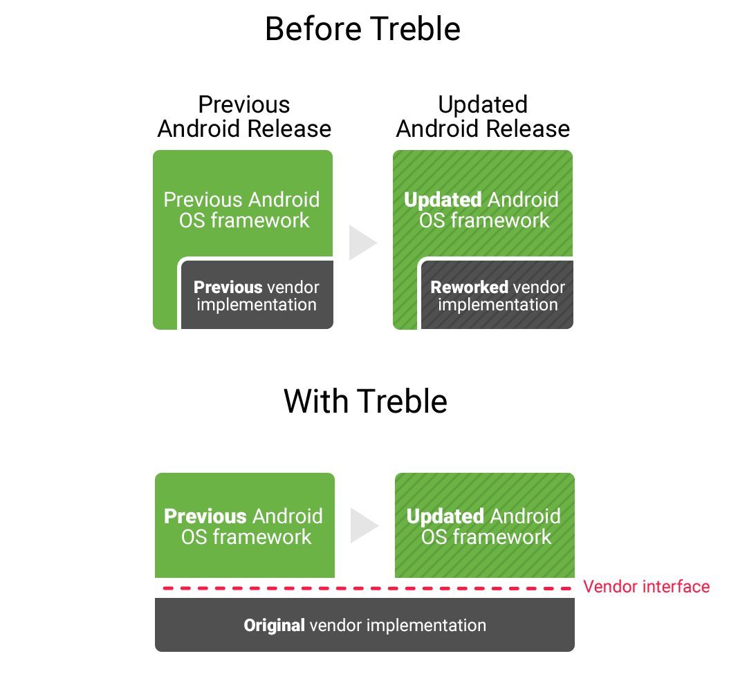 Avec Android O, Google a donc décidé de travailler en amont avec ces partenaires qui fournissent une grande partie des plates-formes utilisées par les constructeurs de smartphones. Pour leur simplifier la vie, la société de Mountain View a choisi de séparer le code nécessaire à la compatibilité avec leurs puces.