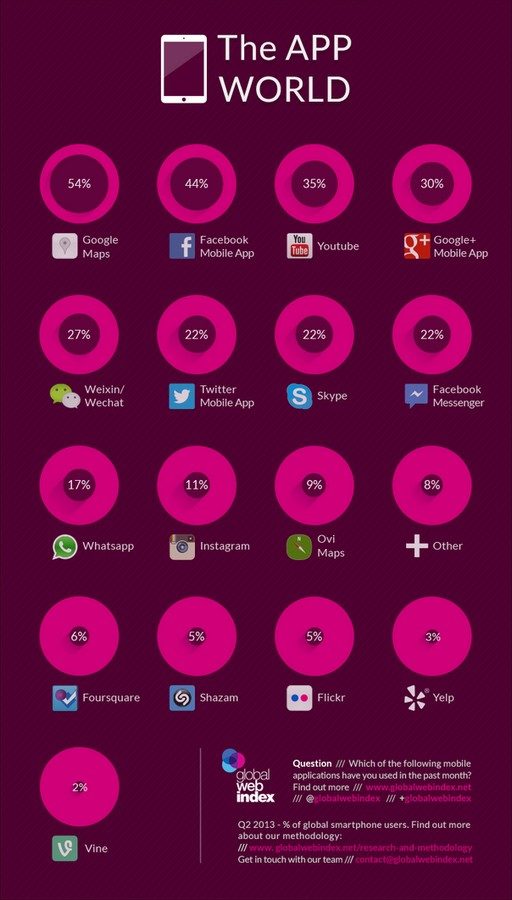 Alors qu’il règne déjà sur les audiences du web classique, Google est également en passe de prendre une position dominante au niveau des applications mobiles. Selon un classement mondial que vient publier le cabinet d’analyse GlobalWebIndex, les applications du géant du web figurent parmi les plus populaires, toutes catégories et plateformes confondues. En tête se trouve Google Maps, utilisée de manière active (plus d’une fois par mois) par 54 % des détenteurs d’un smartphone. En troisième et quatrième position arrivent Youtube (35 %) et Google + Mobile App (30 %).