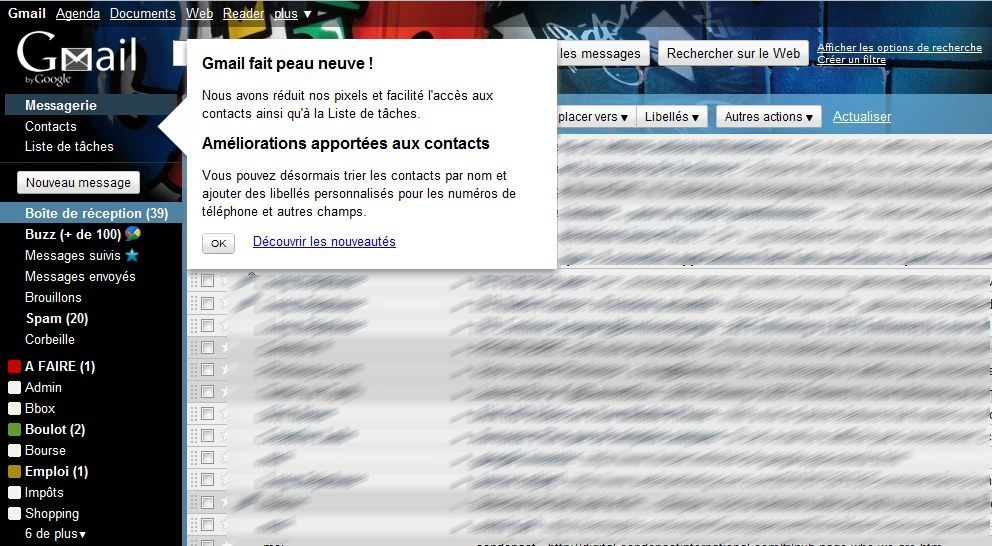 Au-delà de ces quelques nouvelles fonctions, Gmail s’offre un très léger lifting graphique. Les fonctions Messagerie, Contacts et Liste de tâches sont désormais réunies en haut à gauche de l’écran. Et le lien « Nouveau message », désormais bien plus visible, prend la forme d’un bouton. Enfin, c’est par le biais d’un menu déroulant aux côtés du lien « Archiver » que l’on peut sélectionner ses e-mails non-lus ou suivis.