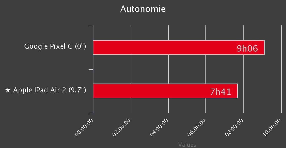 La définition de 2 560 x 1 800 pixels permet à son écran de 10.2 pouces d’afficher une résolution de 308 pixels par pouces. Là encore, c’est mieux que l’iPad Air 2 (écran de 9,7 pouces 2 048 x 1 536 pixels pour une résolution de 264 ppp). La puce Tegra X1 de NVIDIA permet à la Pixel C d’afficher de bonnes performances : 64 098 à AnTuTu et 23 657 sur les graphismes 3D. Avec des scores respectifs de 62 992 et 24 045, l’iPad Air 2 s’avère donc légèrement plus performant en 3D, certainement grâce à sa définition plus basse.