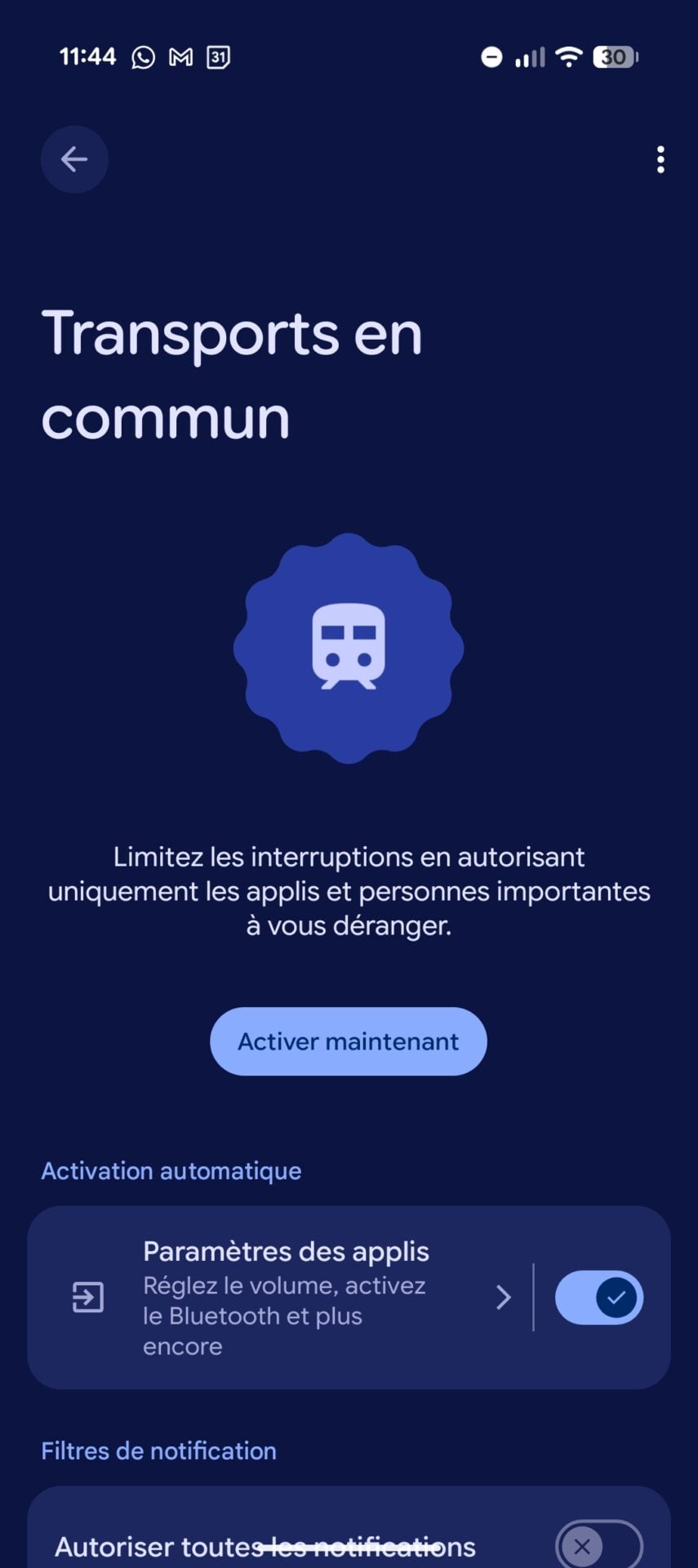 Pour éviter d’être dérangé par des sollicitations inutiles, le mode « Transports en commun » offre aussi la possibilité de filtrer vos notifications pour ne laisser passer que les appels ou messages de vos contacts prioritaires. Enfin, des ajustements visuels comme le passage au thème sombre ou à l’affichage en niveaux de gris sont activables pour limiter la fatigue visuelle ou les distractions.