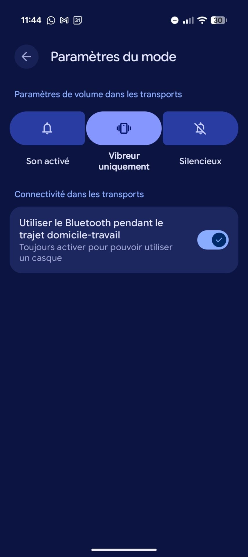 Parmi les options disponibles, vous pouvez ajuster automatiquement votre profil sonore en basculant sur le mode vibreur ou silencieux dès que votre trajet commence. Le système peut également activer le Bluetooth automatiquement pour pouvoir connecter vos écouteurs plus rapidement.