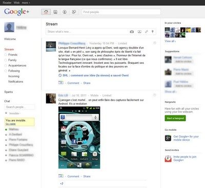 « Notre but avec Google + est de rendre le partage sur le Web comparable au partage dans la vraie vie… [les cercles] ont été très bien accueillis car dans la vraie vie on partage des choses différentes avec des personnes différentes. Les lieux de prédilection [Hangouts] permettent des interactions fortuites comme lorsque vous rencontrez par hasard des amis dans la vraie vie, a indiqué le PDG. Et Larry Page de poursuivre : Google+ est toujours en période d’essai avec un accès limité tant que nous déployons le système […] néanmoins plus de 10 millions de personnes ont rejoint Google+ ».