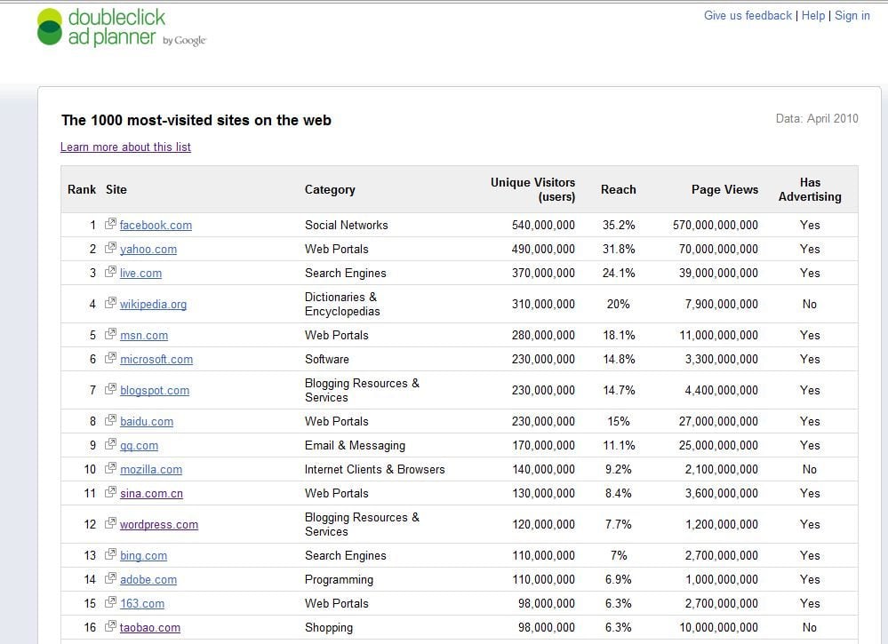 Au cours du mois d’avril 2010, 540 millions d’internautes sont allés sur Facebook pour être sûrs de ne rater aucun des potins publiés par leurs amis. Cette curiosité vaut au réseau social de décrocher la palme du site le plus visité au monde. Google, ou plutôt sa régie publicitaire DoubleClick, vient en effet de publier la liste des 1 000 sites ayant attirés le plus de visiteurs uniques au cours du mois d’avril (1). C’est une première, qui va lui servir à commercialiser de nouveaux services aux annonceurs souhaitant développer leur notoriété.