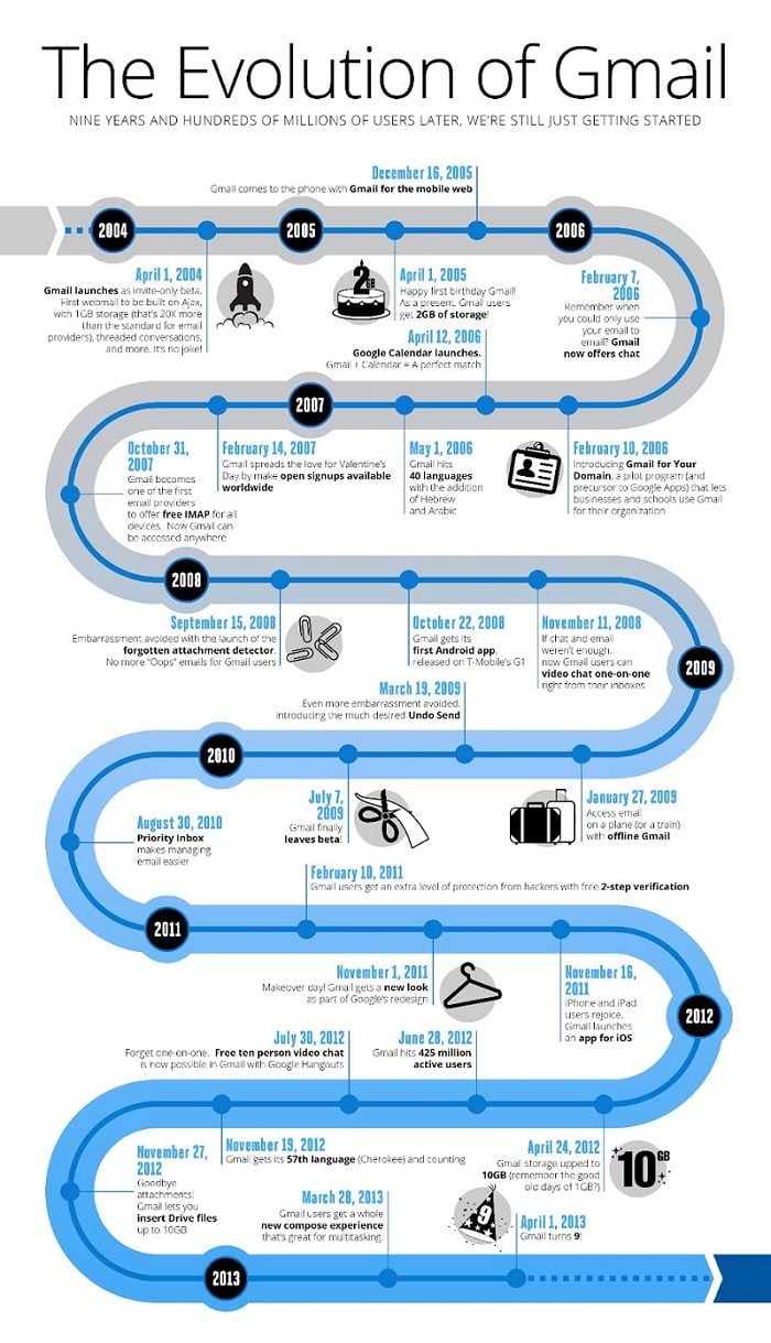Tout commence le 1er avril 2004 quand Gmail est disponible en version beta disponible uniquement sur invitation avec une capacité de stockage de 1 Go. Aujourd’hui, l’espace proposé est de 10 Go.