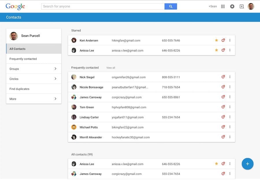 Les contacts Google passent au Material Design ! La firme de Mountain View a présenté il y a quelques heures une version remodelée de son site, qui permet de faire un sacré ménage dans la base parfois un peu désordonnée, voire chaotique de mails, coordonnées téléphoniques et adresses que l’on accumule avec Gmail, Google+ et Hangouts.