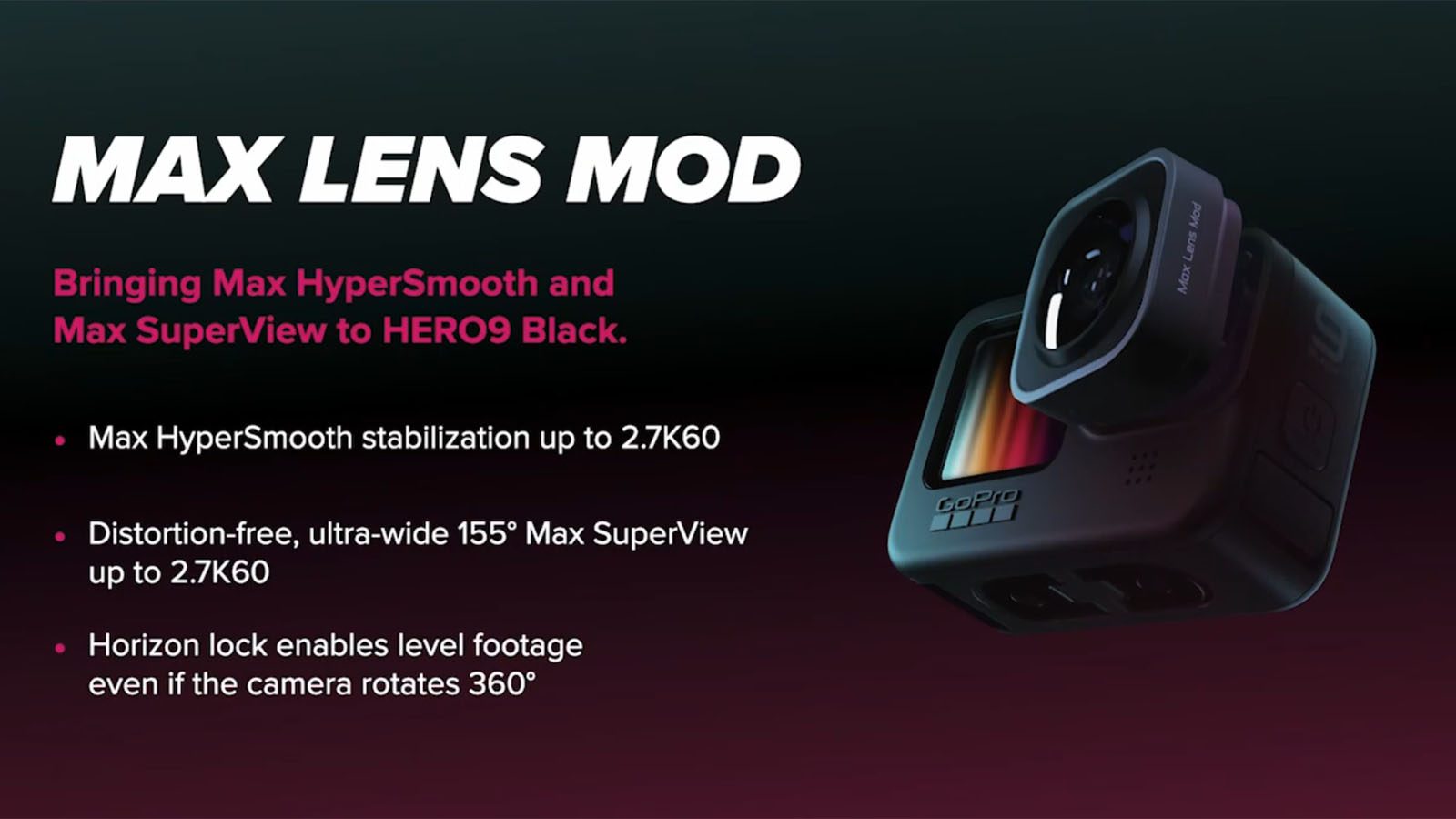 C’est une première : la Hero 9 Black dispose de lentille frontale amovible. En un tournemain, la lentille se retire et on peut ajouter un module optique optionnel appelé Max Lens Mod qui, comme son nom l’indique, permet peu ou prou la même couverture angulaire que la GoPro Max. Le Max Lens Mod permet d’améliorer encore un peu plus la stabilisation d’image – oui, c’est possible – mais aussi de réaliser un maintien de l’horizon (horizon lock) même en faisant des tonneaux (jusqu’en 2,7K60p au maximum). Vive les algorithmes.