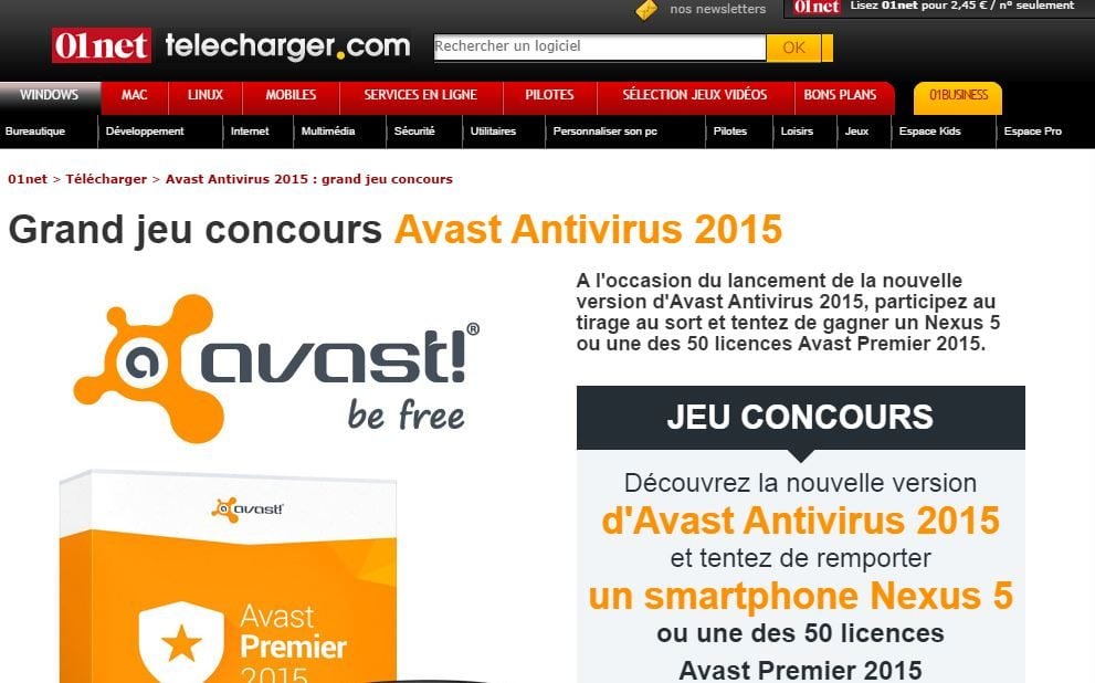 Pour célébrer cet événement, 01net vous propose également de participer à un grand jeu concours. Les prix après tirage au sort ? Un smartphone nexus 5 ou 50 licences payantes d’Avast Premier 2015.