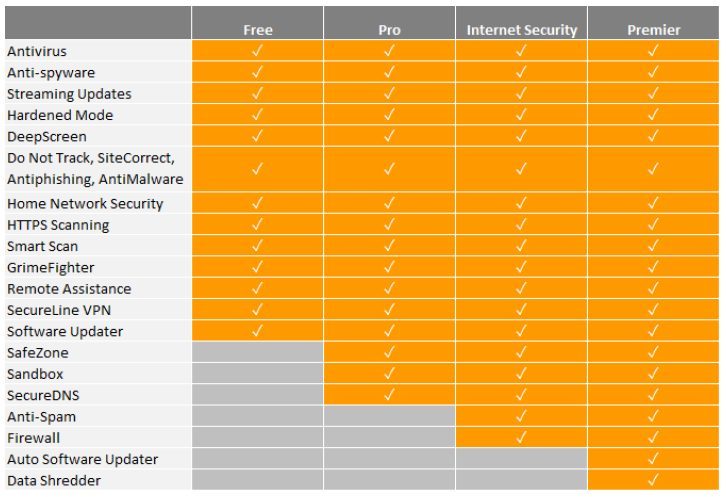 Les différentes fonctions et protections d’Avast, selon les éditions, en un clin d’œil !