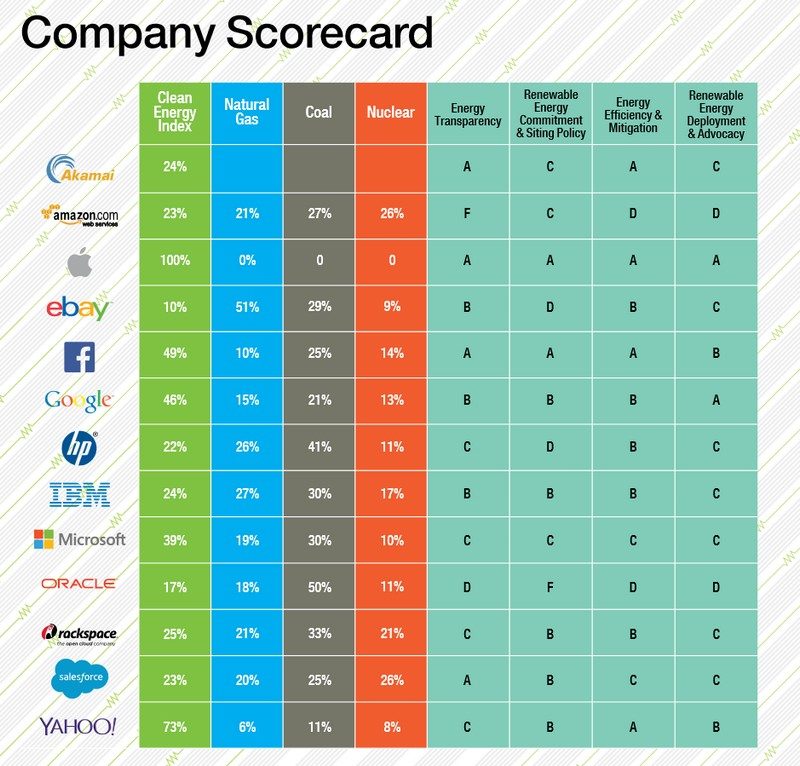 HP, Oracle, eBay, Microsoft ou encore IBM écopent d’un avertissement : ils puisent encore trop majoritairement et abondamment dans le charbon, le nucléaire ou le gaz naturel.