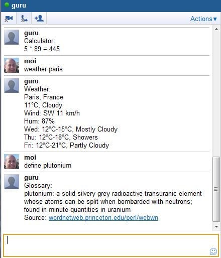 Evidemment, Google Talk Guru n’a rien d’humain, il s’agit simplement d’un « bot », un logiciel capable d’entretenir une conversation basique (ici, répondre aux questions). « Weather Paris » vous renverra un bulletin météo complet sur la capitale. « Translate computer to french » vous répondra instantanément ordinateur.