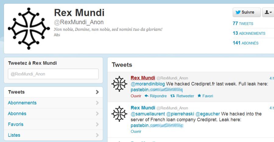 Le groupe de hackers Rex Mundi a récidivé. Et cette fois, c’est à une entreprise française basée à Nice qu’il s’est attaqué. « Nous avons récemment pénétré les serveurs pauvrement protégés de Credipret, un réseau français d’agences de crédit. Les données que nous avons volées contiennent des enregistrements de centaines de clients. Ils comprennent leurs adresses complètes, des informations sur leur famille, leur travail et des informations financières confidentielles », écrivent-ils sur le site de partage de textes Pastebin.