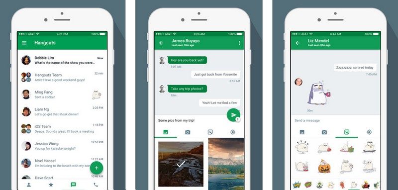 Pour commencer, Hangouts dispose désormais d’une nouvelle interface qui lui fait gagner un véritable menu. Les messages du correspondant de l’utilisateur sont également mieux différenciés avec un fonds vert plus intense qu’auparavant et sur la page des Contacts un bouton circulaire permet d’envoyer un nouveau message plus facilement. Enfin, lorsque l’on tape du texte dans la zone de message, un bouton d’envoi apparaît.