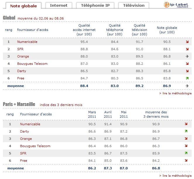 Chaque semaine, IP-Label Newtest mesure pour 01net. les performances des fournisseurs d’accès à Internet à Paris et à Marseille. Trois éléments sont pris en compte : Internet, la téléphonie et la télévision. Une note globale permet d’établir un classement reflétant la capacité des FAI à optimiser leurs services sur les lignes téléphoniques testées.
