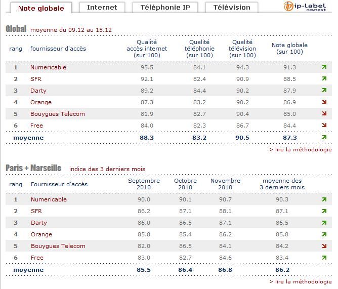 L’impossibilité d’émettre un appel téléphonique empêche Numericable de dominer ses concurrents dans les trois services proposés par les offres triple play. Ses indices pour l’accès à Internet et la télévision lui permettent toutefois de maintenir sa place en tête du classement global. Concernant Bouygues Telecom, les problèmes d’accès à ses serveurs mail pénalisent une nouvelle ses indices, tandis que Darty et SFR profitent de leurs bonnes performances dans l’accès à Internet et la télévision pour améliorer leurs notes.