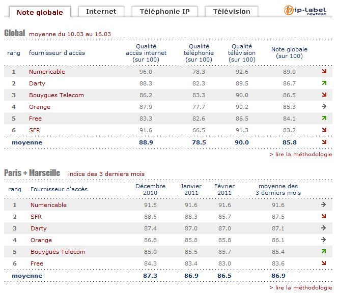 Chaque semaine, IP-Label Newtest mesure pour 01net. les performances des fournisseurs d’accès à Internet à Paris et à Marseille. Trois éléments sont pris en compte : Internet, la téléphonie et la télévision. Une note globale permet d’établir un classement général reflétant la capacité des FAI à optimiser leurs services sur les lignes téléphoniques testées.