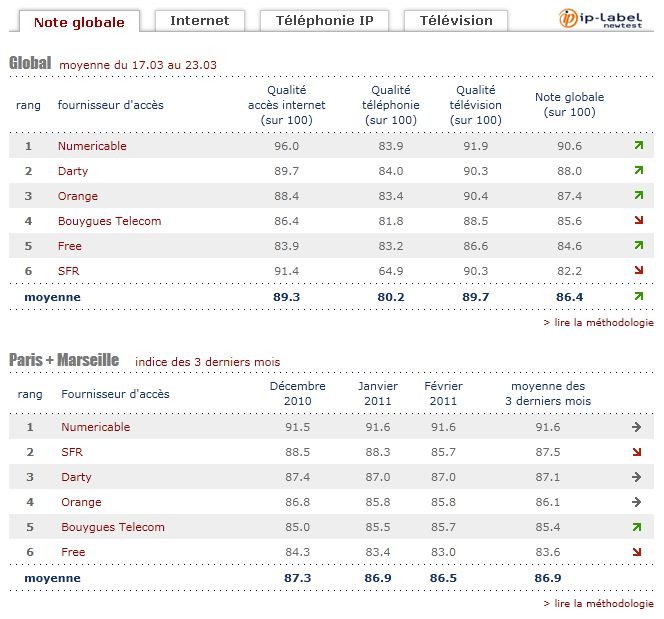 Chaque semaine, IP-Label Newtest mesure pour 01net. les performances des fournisseurs d’accès à Internet à Paris et à Marseille. Trois éléments sont pris en compte : Internet, la téléphonie et la télévision. Une note globale permet d’établir un classement général reflétant la capacité des FAI à optimiser leurs services sur les lignes téléphoniques testées.