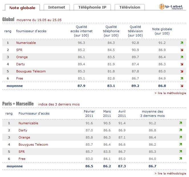 Chaque semaine, IP-Label Newtest mesure pour 01net. les performances des fournisseurs d’accès à Internet à Paris et à Marseille. Trois éléments sont pris en compte : Internet, la téléphonie et la télévision. Une note globale permet d’établir un classement reflétant la capacité des FAI à optimiser leurs services sur les lignes téléphoniques testées.