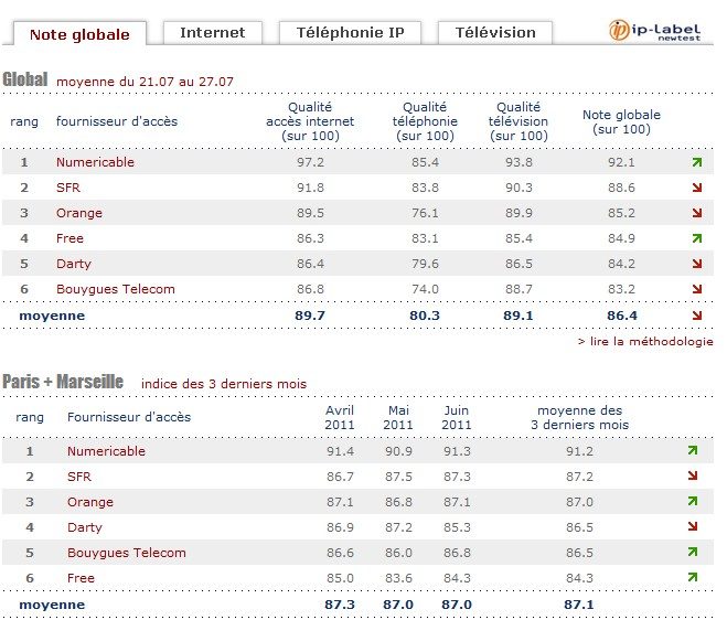 Chaque semaine, IP-Label Newtest mesure pour 01net. les performances des fournisseurs d’accès à Internet à Paris et à Marseille. Trois éléments sont pris en compte : Internet, la téléphonie et la télévision. Une note globale permet d’établir un classement reflétant la capacité des FAI à optimiser leurs services sur les lignes téléphoniques testées.