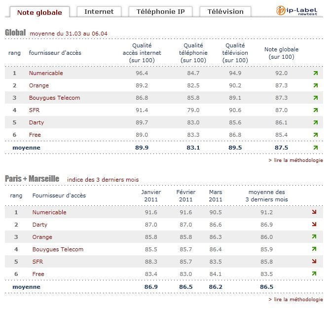 Chaque semaine, IP-Label Newtest mesure pour 01net. les performances des fournisseurs d’accès à Internet à Paris et à Marseille. Trois éléments sont pris en compte : Internet, la téléphonie et la télévision. Une note globale permet d’établir un classement général reflétant la capacité des FAI à optimiser leurs services sur les lignes téléphoniques testées.