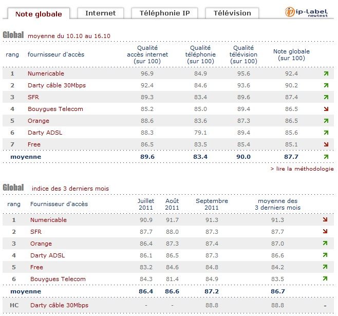 Chaque semaine, IP-Label Newtest mesure pour 01net. les performances des fournisseurs d’accès à Internet en région parisienne (Paris et Massy) et en province (Marseille et Nantes). Trois éléments sont pris en compte : Internet, la téléphonie et la télévision. Une note globale permet d’établir un classement reflétant la capacité des FAI à optimiser leurs services sur les lignes téléphoniques testées.
