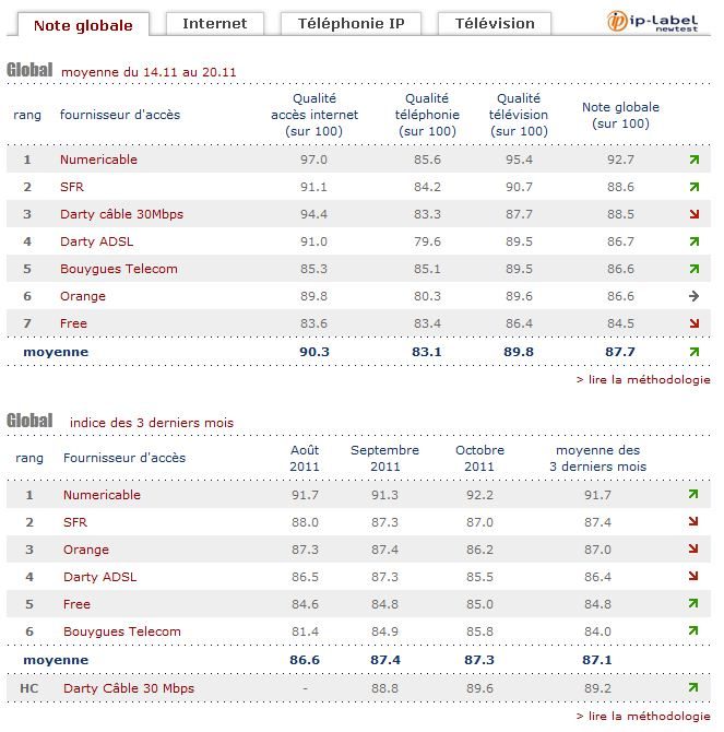 Chaque semaine, IP-Label Newtest mesure pour 01net. les performances des fournisseurs d’accès à Internet en région parisienne (à Paris et à Massy) ainsi qu’en province (à Marseille et à Nantes). Trois éléments sont pris en compte : Internet, la téléphonie et la télévision. Une note globale permet d’établir un classement reflétant la capacité des FAI à optimiser leurs services sur les lignes téléphoniques testées.