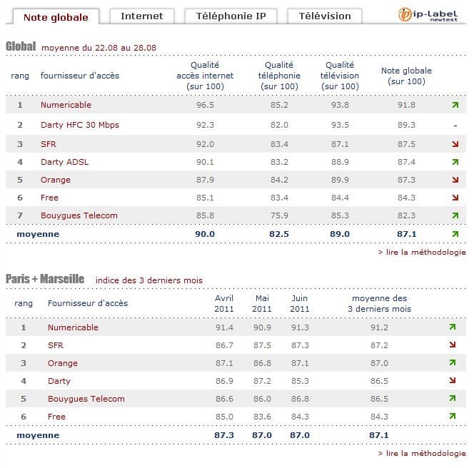 Chaque semaine, IP-Label Newtest mesure pour 01net. les performances des fournisseurs d’accès à Internet à Paris et en province (Marseille et Nantes). Trois éléments sont pris en compte : Internet, la téléphonie et la télévision. Une note globale permet d’établir un classement reflétant la capacité des FAI à optimiser leurs services sur les lignes téléphoniques testées.