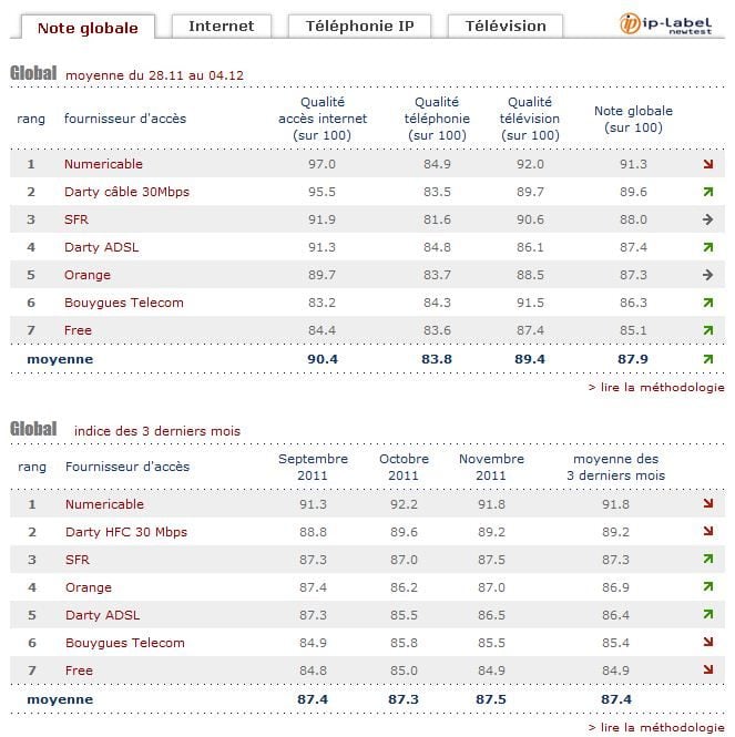 Le classement global des solutions triple play évaluées cette semaine voit ses indicateurs progresser. Ce sont essentiellement les belles performances observées sur l’accès à Internet qui tirent les notes vers le haut. Les tests réalisés sur les services de téléphonie IP ont également été très positifs, puisqu’un seul des 8 232 appels téléphoniques n’a pas abouti à un résultat satisfaisant.