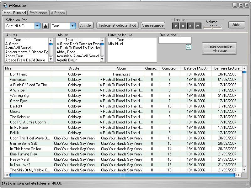 comme l’a voulu Apple, ne permet de transférer la musique que dans un sens : d’iTunes vers un iPod. Voilà pourquoi un outil comme i+Rescue se révèle bien pratique. Il enregistre dans un dossier tous les titres présents sur votre