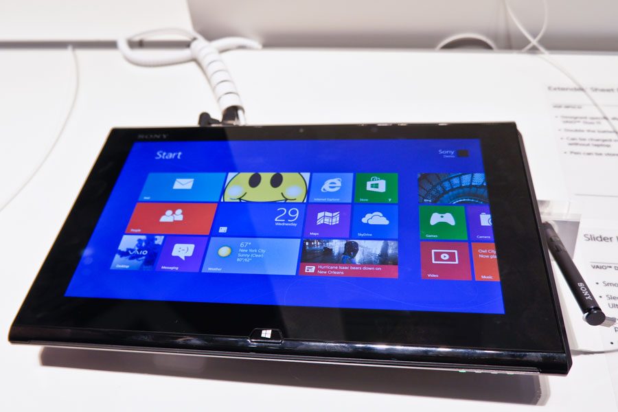 Sony a également annoncé le lancement prochain de deux nouveaux concepts d’ordinateurs Vaio, pensés pour Windows 8. Le premier est un combiné ultrabook/tablette baptisé Vaio Duo 11 fabriqué au Japon (alors que la plupart des Vaio pour le grand public sont maintenant fabriqués en Chine) et le second, un tout-en-un 20 pouces tactile, le Vaio Tap 20.