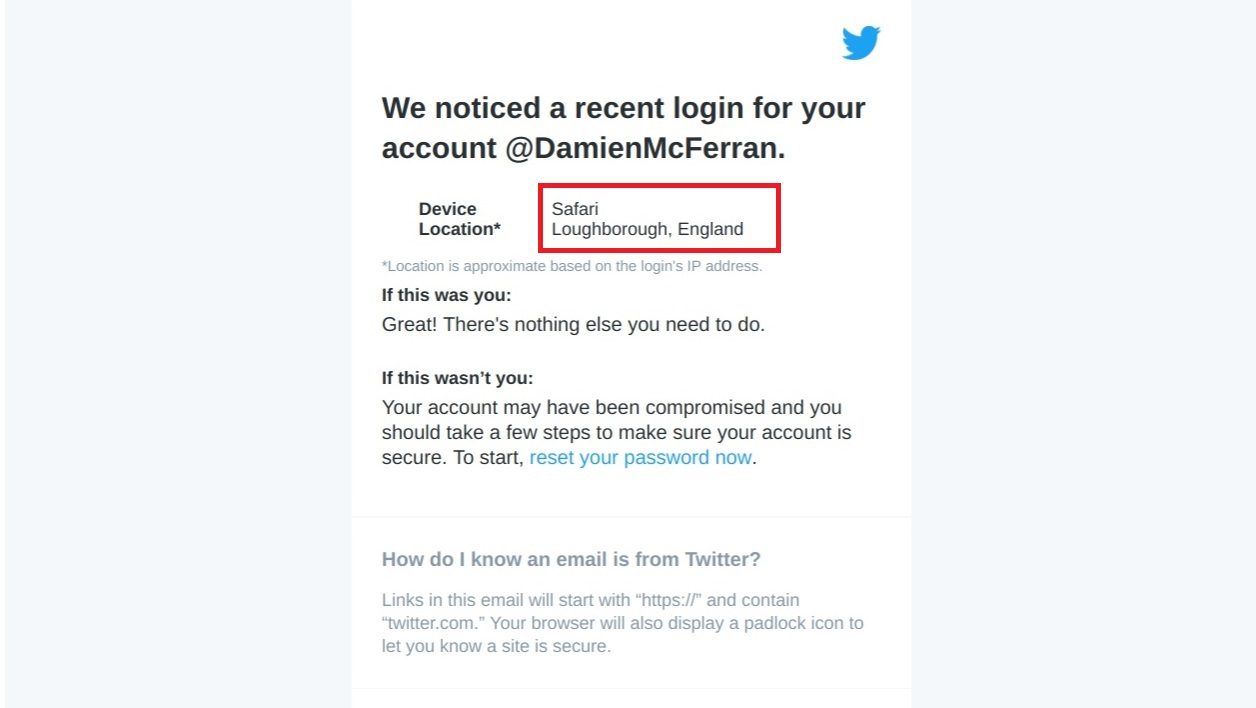 Lors de la première connexion à Twitter, le réseau social envoie automatiquement un courrier électronique de sécurité pour indiquer qu’un nouvel appareil vient de se connecter. Cela permet de détecter un éventuel piratage du compte ou une utilisation frauduleuse. Le message comporte le lieu de connexion, mais aussi l’appareil. Et pour la Switch, c’est le navigateur Safari qui est indiqué !