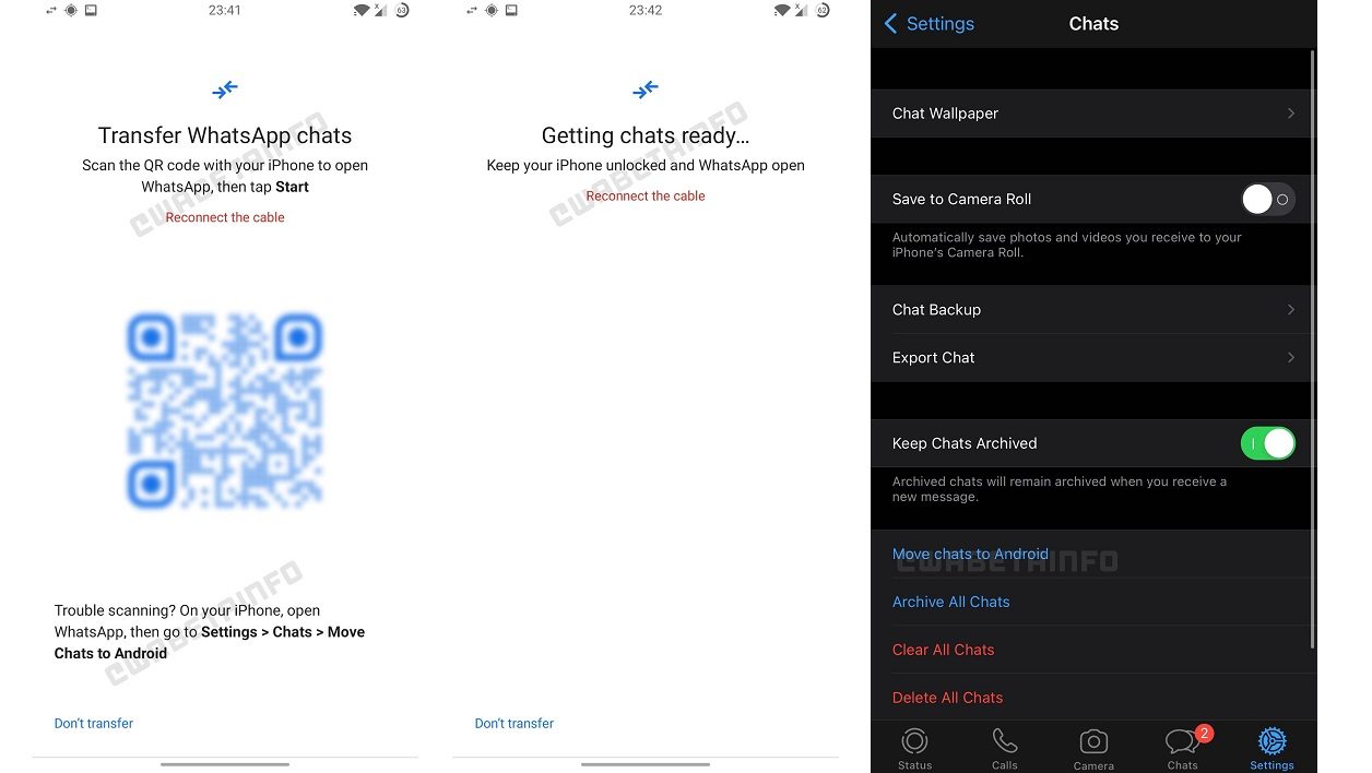 L’utilisateur doit scanner un QR code avec son iPhone pour lancer l’appli WhatsApp et commencer l’opération. Celle-ci nécessite que l’appli soit ouverte et que le smartphone soit déverrouillé. La dernière capture montre l’arrivée d’une option Move chats to Android (déplacer les chats vers Android) dans les paramètres de WhatsApp. Le processus pourrait impliquer d’utiliser un câble, sans que l’on sache encore s’il faudra passer par un ordinateur.