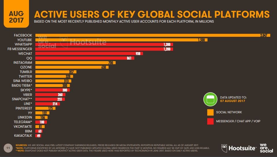 Le Global Digital Snapshot du mois d’août présente un graphique avec l’audience comparée de toutes les plateformes sociales qui comptent, messageries instantanées comprises. Premier enseignement, Facebook et YouTube écrasent le classement avec respectivement 2 et 1,5 milliards d’abonnés. Très loin derrière, on trouve Instagram (700 millions), Tumblr (357 millions), Twitter (328 millions) ou encore Pinterest (175 millions).