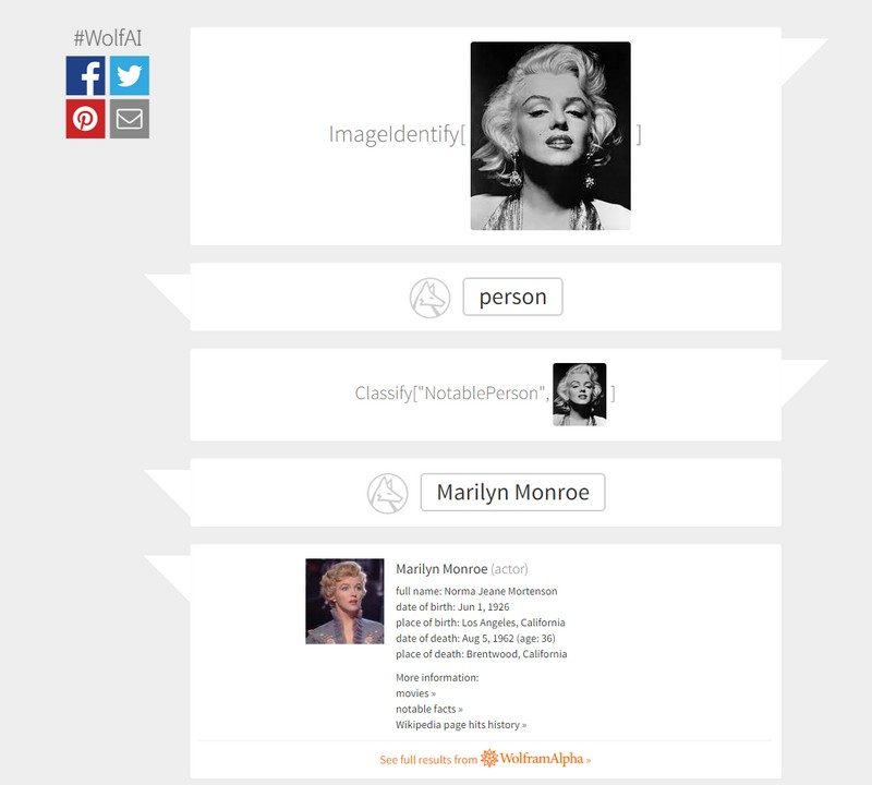 Pour l’utiliser, rien de plus simple : il suffit de se rendre sur le site, de prendre ou de télécharger une photo et de la faire analyser par le réseau neuronal de Wolfram. Premier essai, avec une photo sans légende de Marilyn Monroe. Il nous annonce presque aussitôt le nom complet de l’actrice, propose une notice biographique, tout en précisant que c’est une personne célèbre et qu’elle a tourné dans des films. Il nous renvoie même vers sa fiche Wikipedia. Seconde tentative avec une canette de soda, que le programme reconnait parfaitement, puis avec une cigarette électronique, où il est plus flou (c’est un “appareil”).