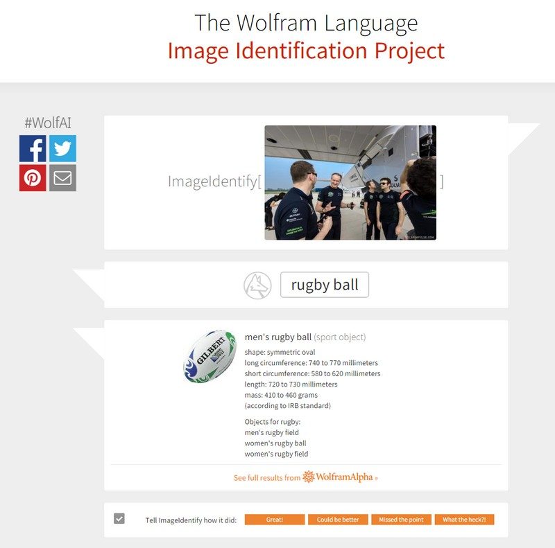 Mais notre dernier essai, avec un cliché de l’équipe de Solar Impulse sur un tarmac avec l’avion solaire dans le fond, s’est révélé plus problématique. Car cette fois Image Identify croit reconnaître… une ballon de rugby ! Curieux.
