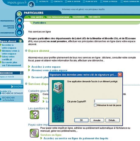 dernier avis d’imposition. Une fois l’enregistrement effectué, un certificat électronique, valable 3 ans, authentifie le visiteur sur le site, moyennant un mot de passe. Le contribuable peut aussi effectuer des simulations ou régler ses impôts