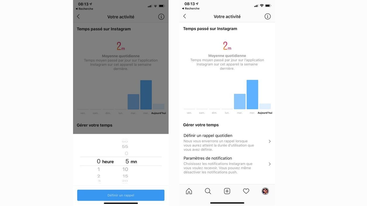 Pour la trouver, il faut cliquer sur le « burger menu » depuis votre page de profil. Apparaît alors une nouvelle rubrique baptisée « Votre activité ». C’est ici qu’Instagram centralise les données et affiche un graphique récapitulant le temps passé sur l’application chaque jour depuis une semaine.