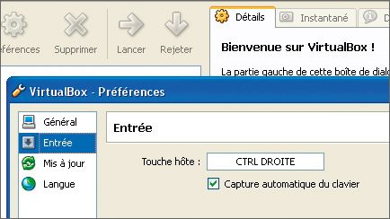 Le menu Fichier vous donne accès à la gestion des disques durs virtuels et des préférences. Intéressons-nous au sous-menu Préférences. Il permet de définir une touche d’entrée et de sortie dans le PC virtuel.