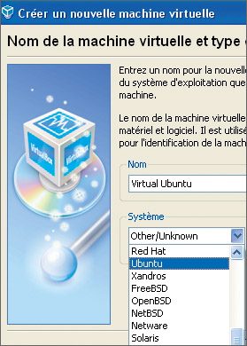 L’assistant de création de machine virtuelle se lance, cliquez sur Suivant. Baptisez votre PC virtuel et choisissez le type de système d’exploitation que vous voulez y installer. Nous avons choisi Ubuntu.