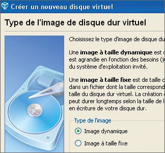 2- Vous voici dans l’écran de création de disque dur virtuel, cliquez sur Nouveau. L’assistant de création de disque se lance, cliquez sur Suivant et cochez Image dynamique, l’espace
