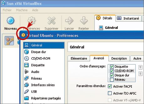 Cliquez sur l’engrenage doré. Dans le menu Général, ouvrez l’onglet Avancé et décochez la boîte Disquette si vous ne possédez pas de lecteur. Cliquez à gauche sur CD/DVDRom et cochez