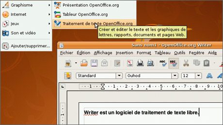 Nous avons choisi pour l’exemple la suite bureautique libre OpenOffice, dont une partie de la version 2.4 est intégrée à Ubuntu. Pour voir à quoi ressemble le traitement de texte Writer, rendez-vous dans le menu