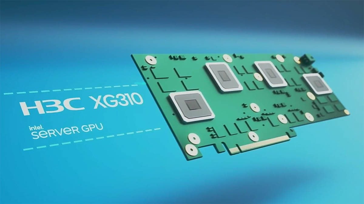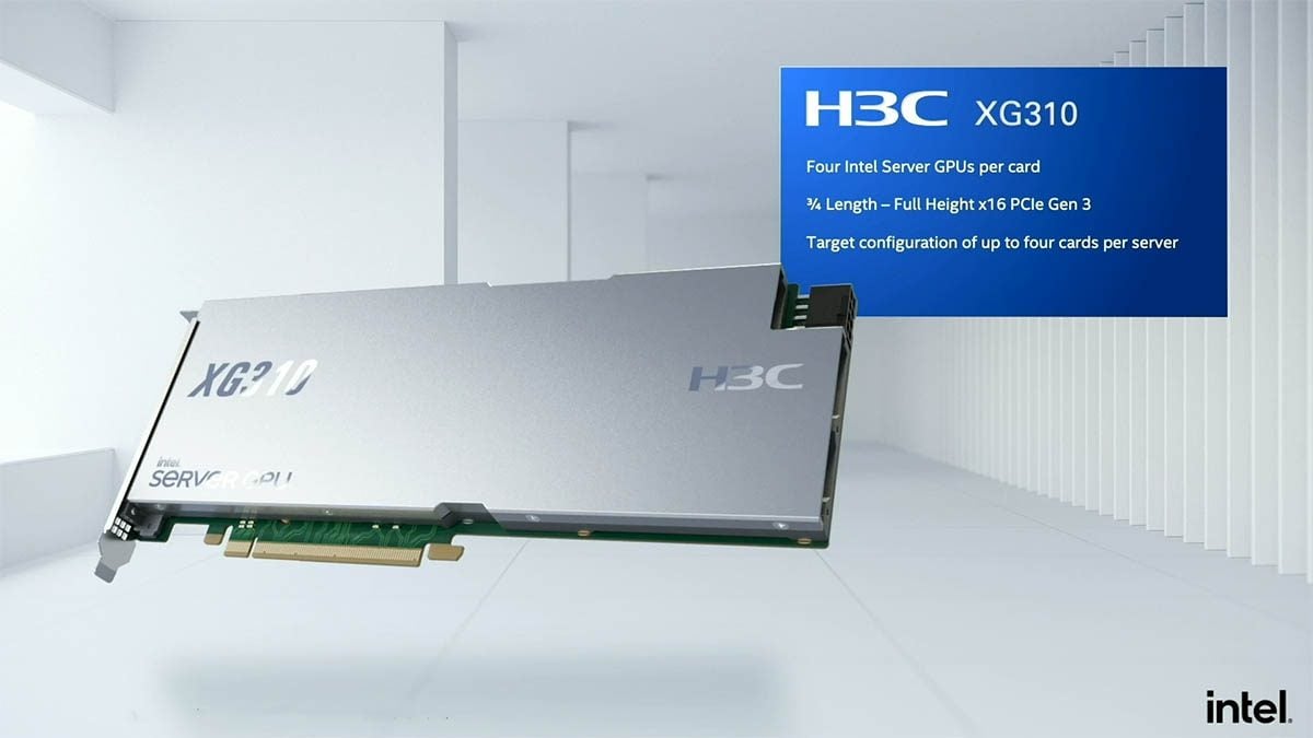 Sous le nom barbare de H3C XG310 se cache une carte intégrant 32 Go de LPDDR4 pas moins de quatre GPU de génération « Xe LP ». Si Intel n’a pas communiqué le nom officiel de cette puce, la mention Xe LP indique bien qu’il s’agit de sa version la moins puissante de son architecture Xe, ici parallélisée et surcadencée par rapport aux puces mobiles intégrées grand public.