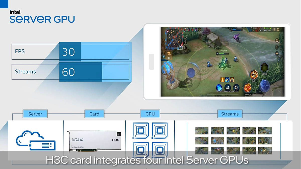 Le premier marché auquel cette carte s’attache est celui du streaming… de jeux Android. En partenariat avec le géant chinois Tencent, Intel a fait une démonstration à la presse pour permettre d’évaluer les performances de sa carte. Chaque GPU est ainsi capable de piloter et rendre en 3D pas moins de 15 parties d’Arena of Valor en 720p30.