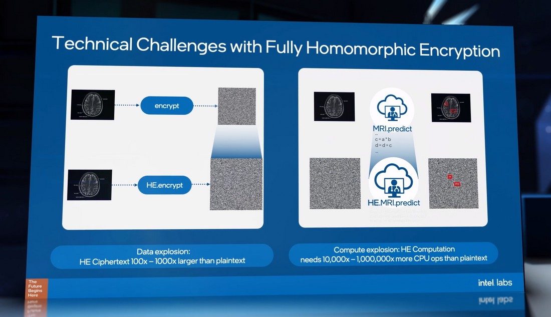 Les algorithmes FHE existent depuis des années, mais pour l’instant ils sont inutilisables car ils ralentissent énormément les calculs. Selon Intel, ils font gonfler le volume de données à traiter d’un facteur 100 voire 1000. Par ailleurs, ils peuvent multiplier le nombre d’opérations par un million. Une seconde de calcul classique se transforme alors en 12 jours de calcul homomorphe.