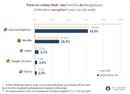 Il domine toujours, mais de moins en moins. Selon les derniers chiffres publiés par AT Internet Institute (1), Internet Explorer (IE) affichait en septembre dernier une part de marché de 62 % en moyenne du trafic des sites Web européens. C’est moins qu’en mars 2009, où celle-ci atteignait 64,6 %, et qu’en novembre 2008 (67,2 %).